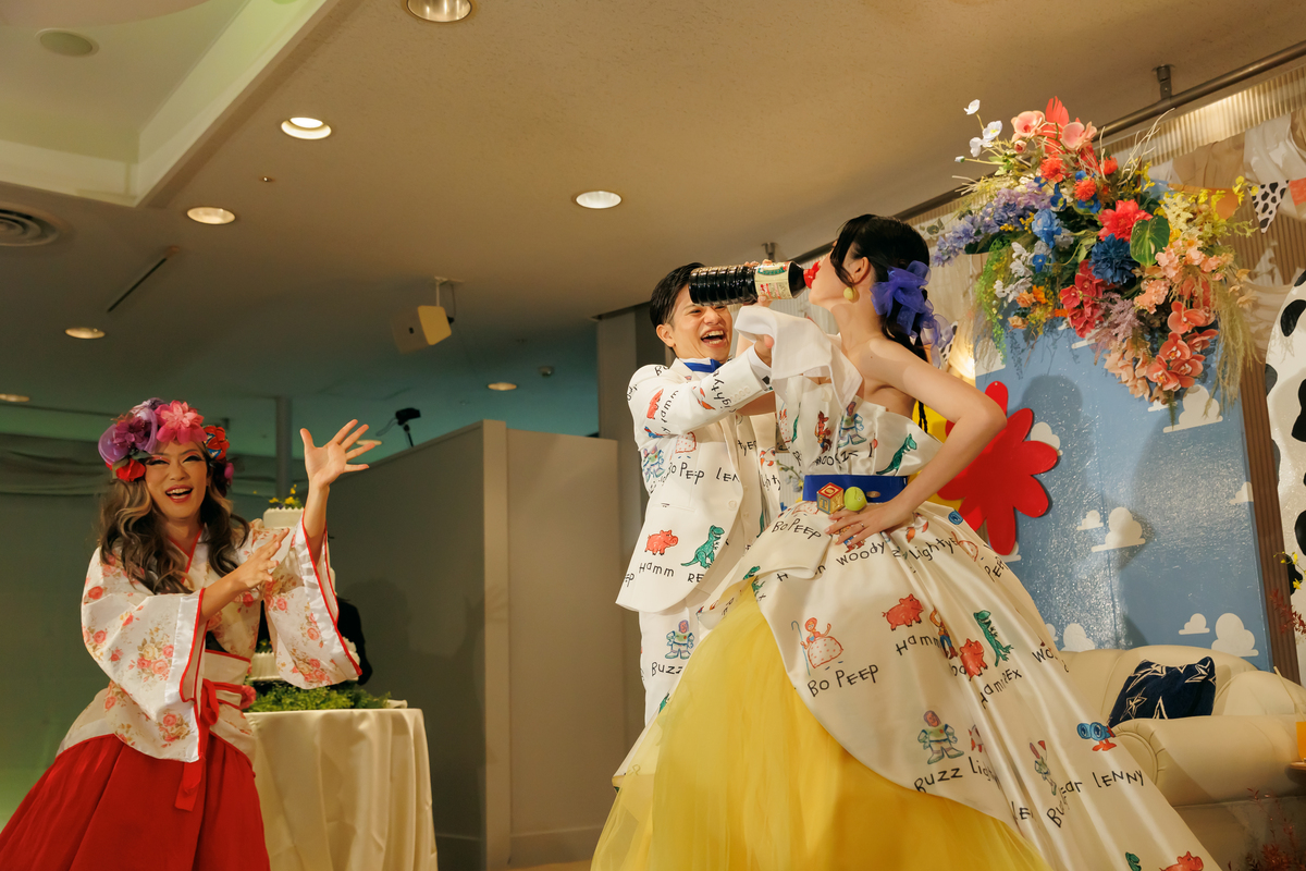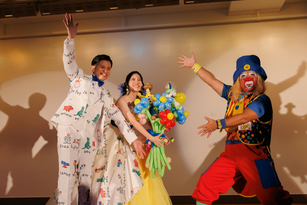 \トイストーリの世界で叶える最高のウェディング/こだわりPOINT・大好きなディズニーの世界を詰め込みたい!・ゲストに楽しんでもらえるようなこだわり余興をオーダーしたい・ヘアメイクにも遊び心を♡会場装飾やbgm、プログラムやムービーの細かい部分までおふたりの大好きなディズニーの世界に。余興ゲストにはバルーンアートのピエロさん&ドラァグクイーンのスペシャルパフォーマンス!こだわりのヘアメイクも会場の雰囲気とベストマッチ。大盛り上がりのウェディングとなりました◎