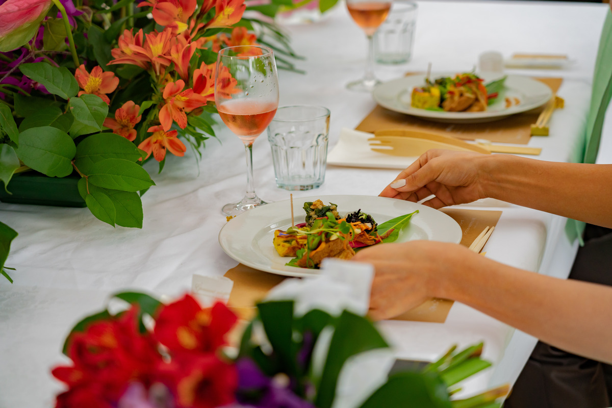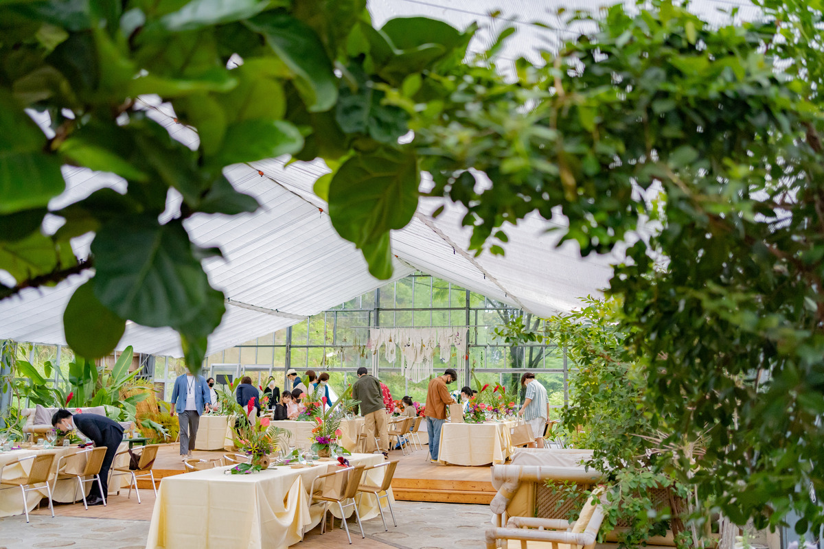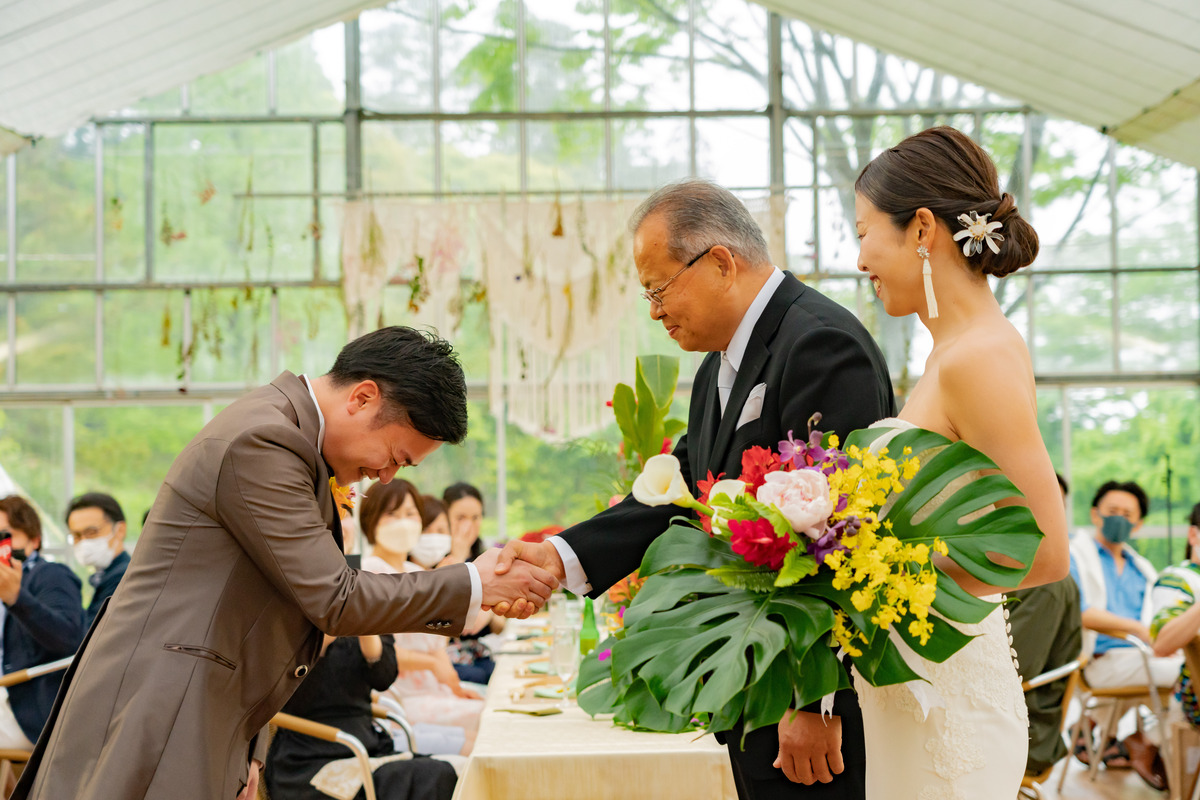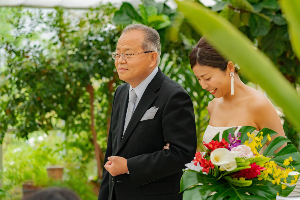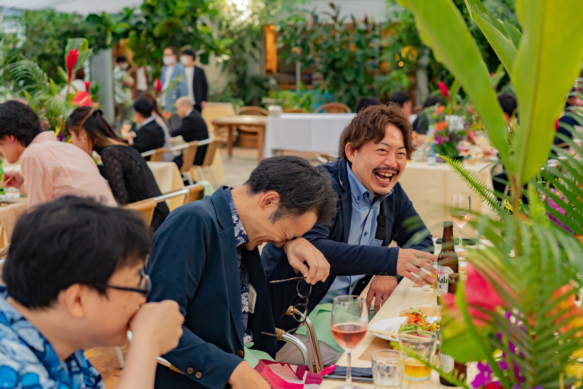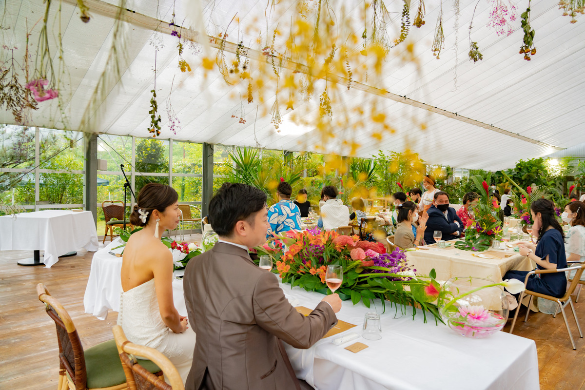 青い海と空が訪れる人々を魅了する宮崎県青島エリアそんな青島に惚れ込んで移住を決めたおふたりこの地で紡いだご縁に感謝を伝えたいもちろんこの青島の地で会場は青島を見渡すボタニカルなカフェコーディネートはパラダイスをテーマに青島らしい鮮やかなデザインに緑に囲まれリラックスした雰囲気に合わせドレスコードもカジュアルに会場デザインに合わせて料理も色彩豊かに愛する青島で叶えた結婚式はゲストの笑顔に溢れまるでおふたりの人柄を映したような温かなひとときになりました。