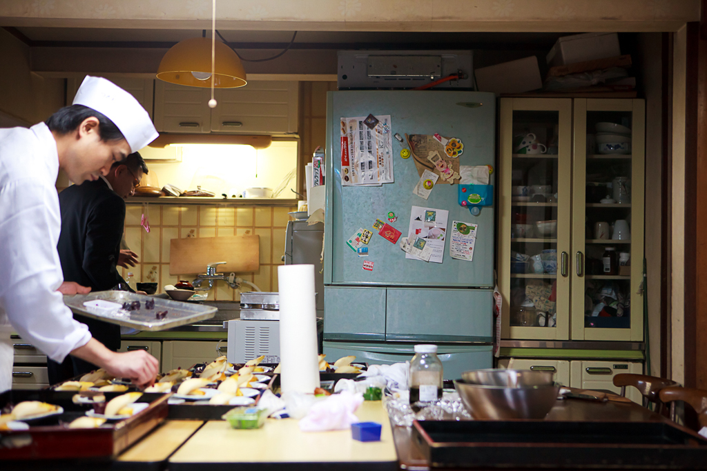 ご自宅での披露宴とは云え、仕出しのお弁当ではちょっとさみしいですよね。 そこで 名古屋でも指折りの料亭さんのケータリング。保冷車3台 ハイエース1台 材料に食器も持ち込んでいた前さんがキッチンで腕をふるってくださいました。