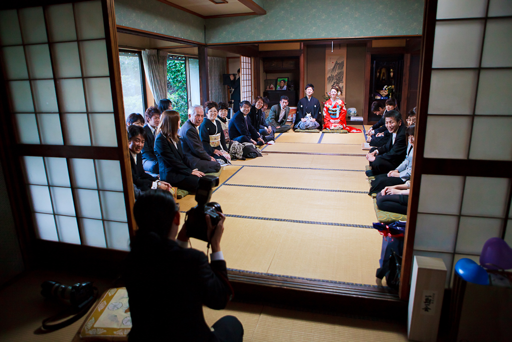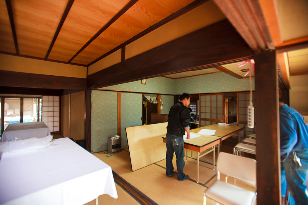 何度もご実家にお邪魔して、お部屋のサイズを測り、テーブル配置 音響設備 スクリーンといろんなものを持ち込むので、関係各社さんのお知恵をお借りしてのパズルでした。 当日の搬出入には細心の注意を払い、スタッフ総出! いつもは家族だんらんの和室が、瞬く間に披露宴会場へと早変わり。