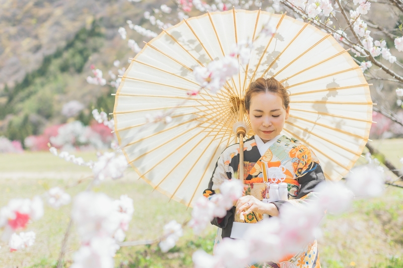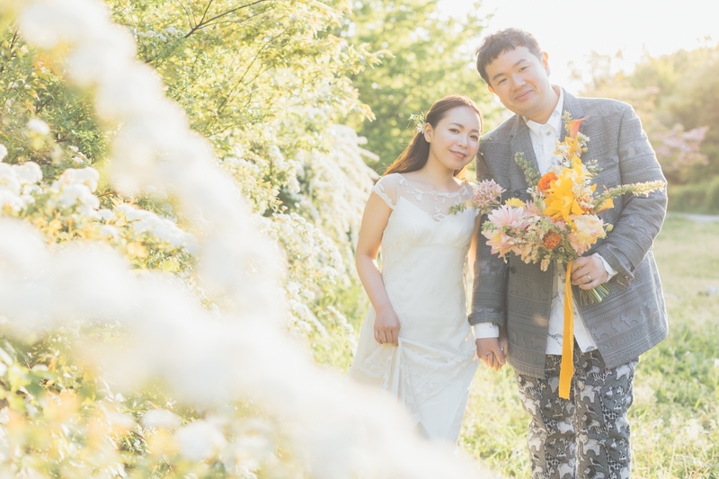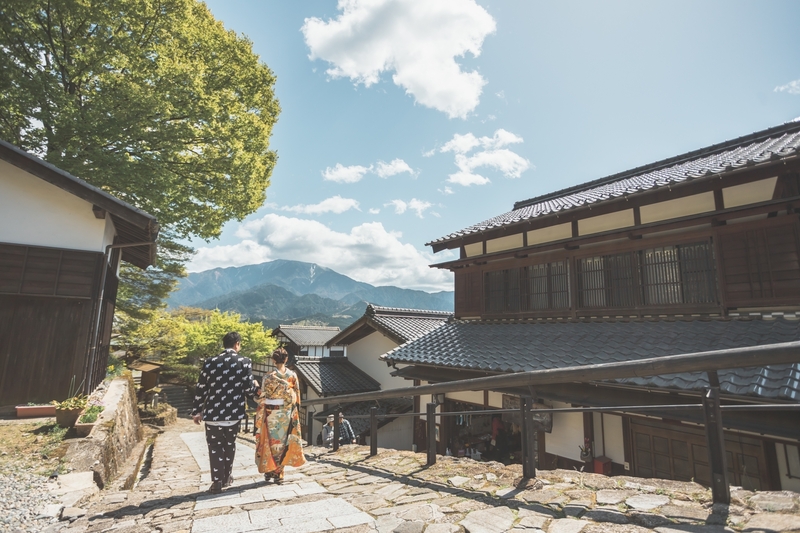当日は晴天。花桃が満開の中で着物姿を撮影し、その後、岐阜県馬籠宿の古い街並みを散歩しながら和装の撮影を。最後は名古屋市内の公園でウェディングドレス撮影。和装の華やかさも、ドレスの繊細さも、お二人の魅力をとっても引き立てていました。