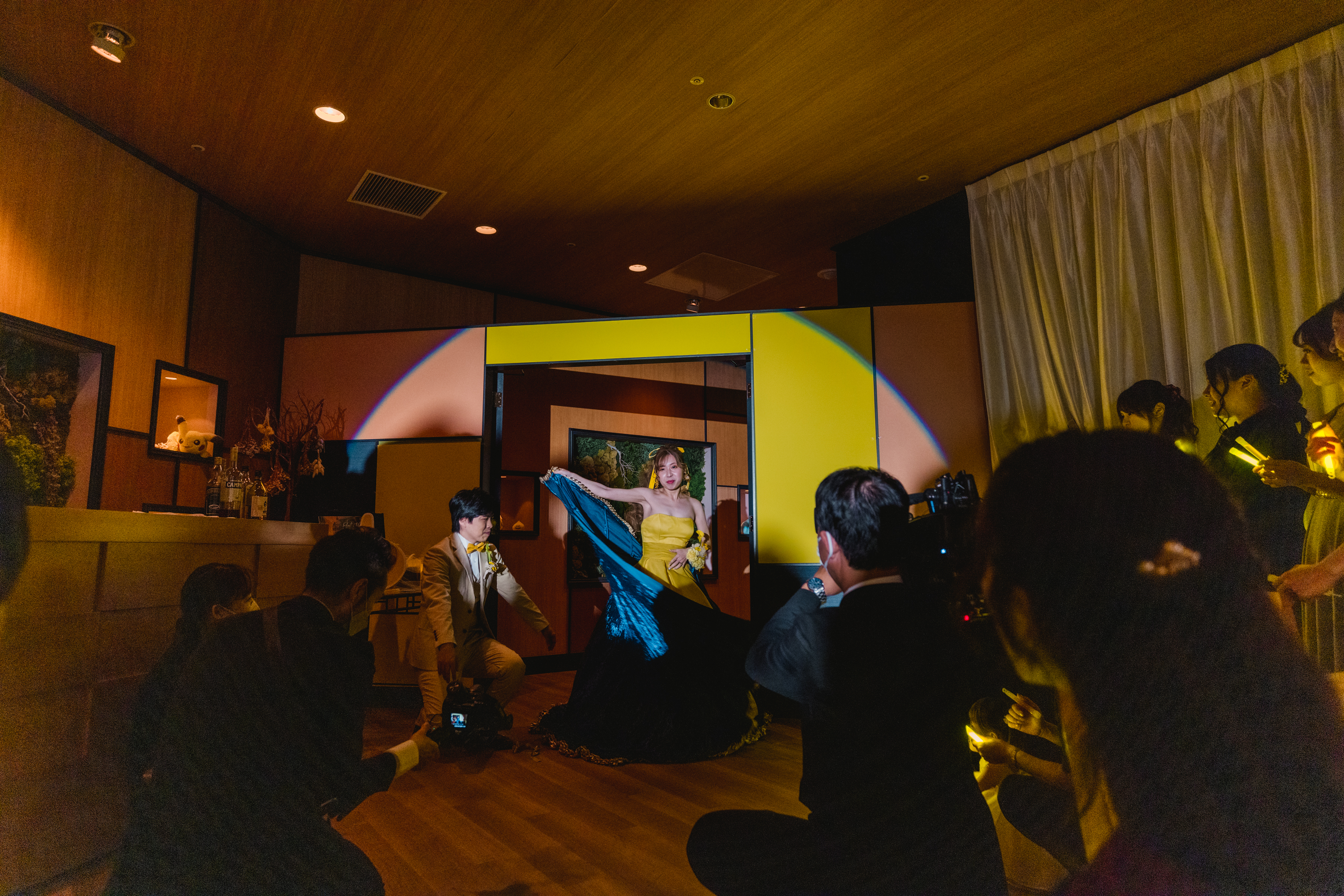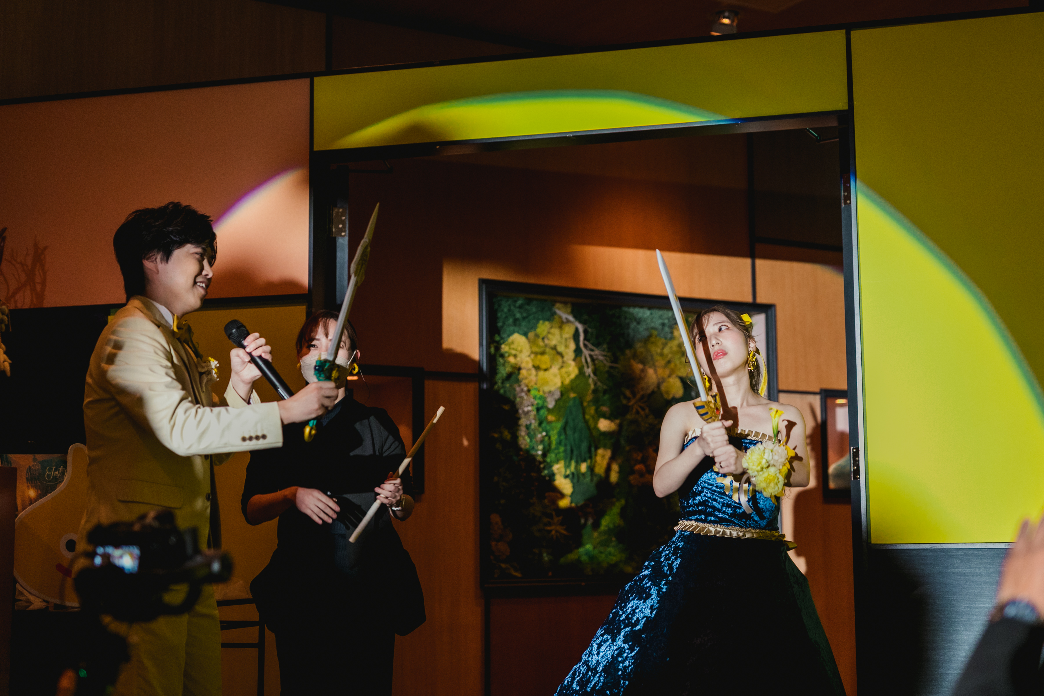 殺陣からの青ドレスから黄ドレスへの瞬時の着替えは大成功!ゲストの大歓声が会場内に響きました。