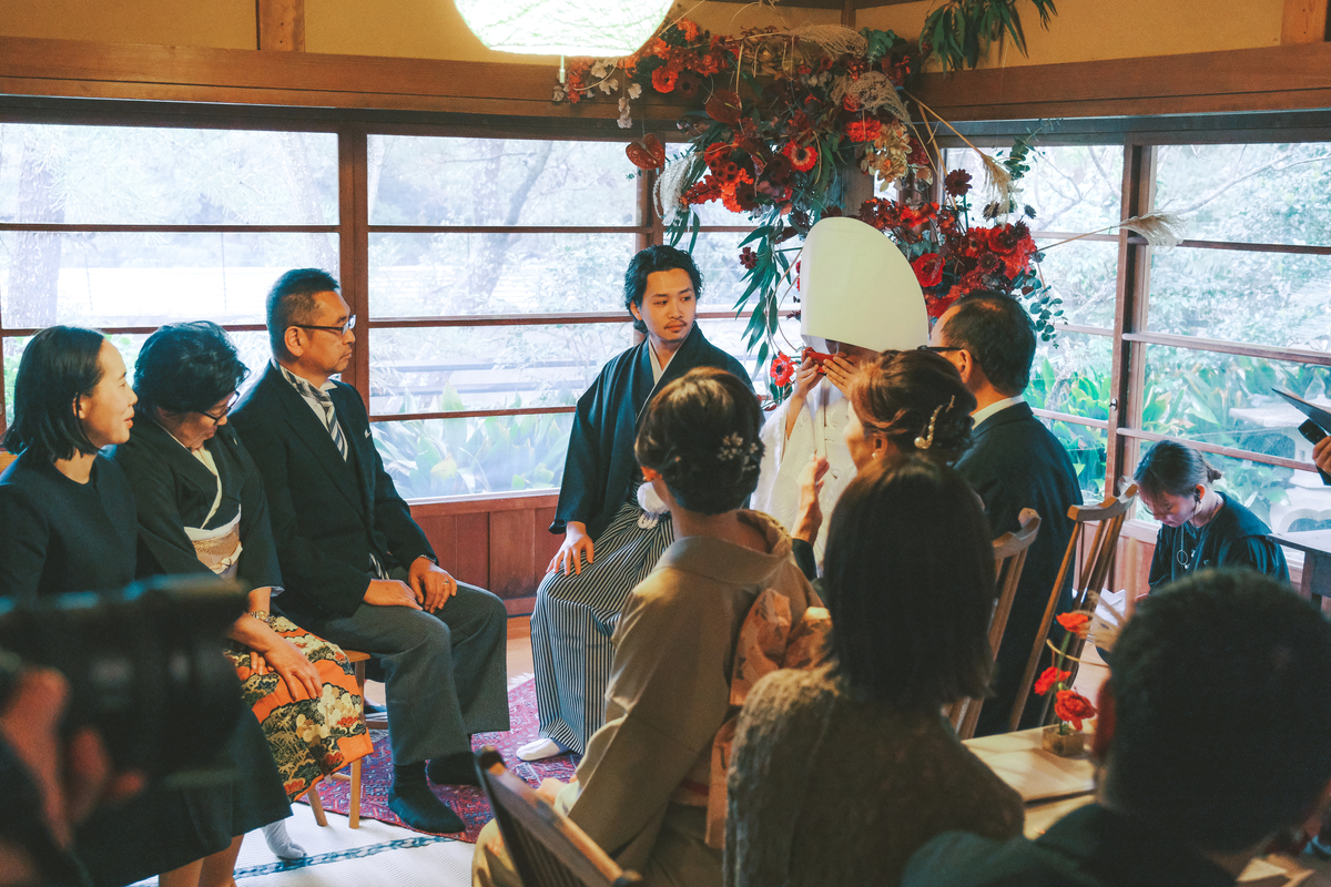 祝言では、ご家族の絆を深める為に、両家の地元のお酒を盃で飲み交わし、結びには、花嫁さまから親御様へのお手紙も読んでいただきました。
