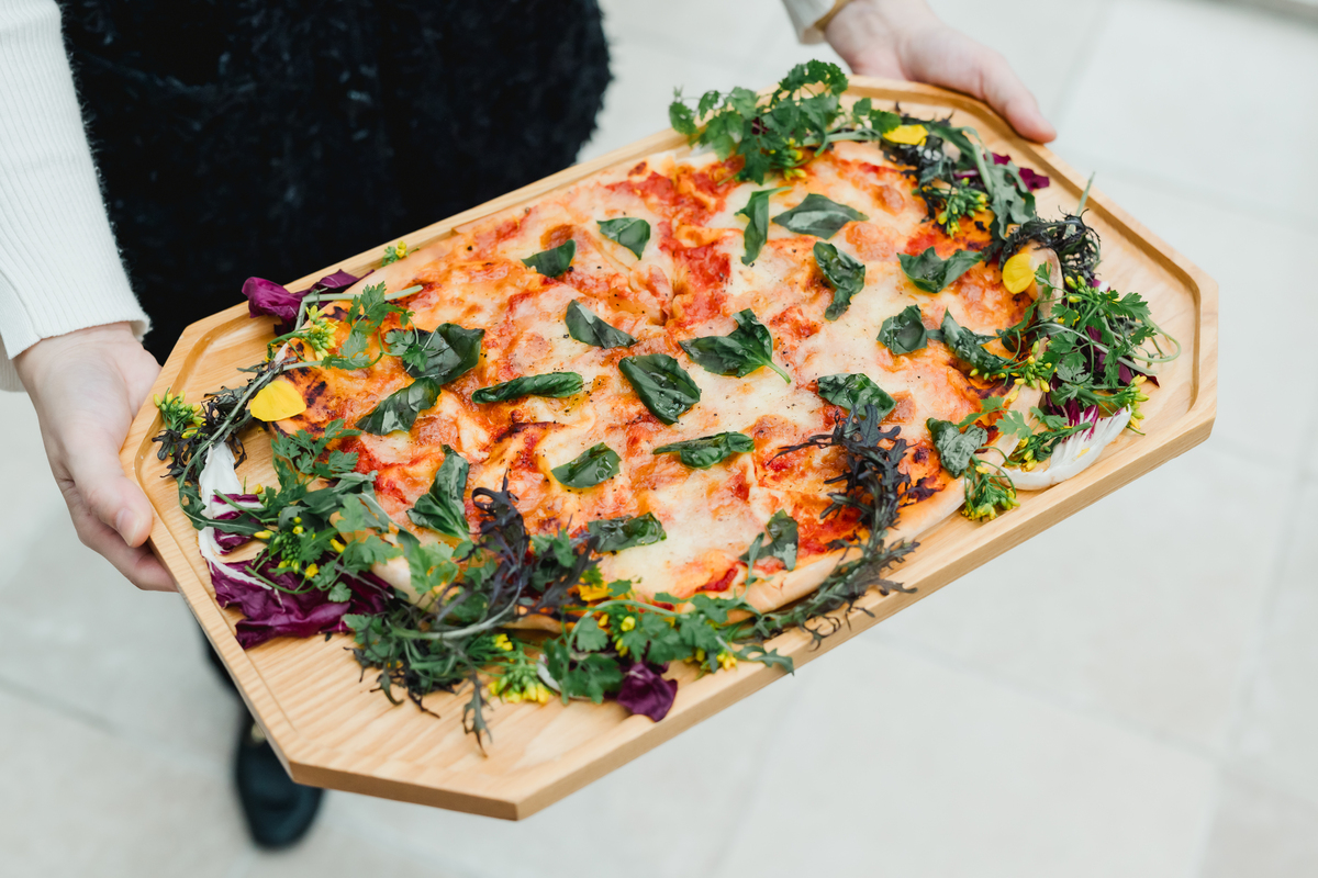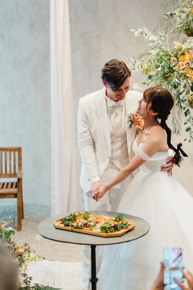 →ケーキ入刀の代わりに新郎さまが大好きなPIZZA入刀を行いました!もちろんゲストの皆様へもふるまいました!