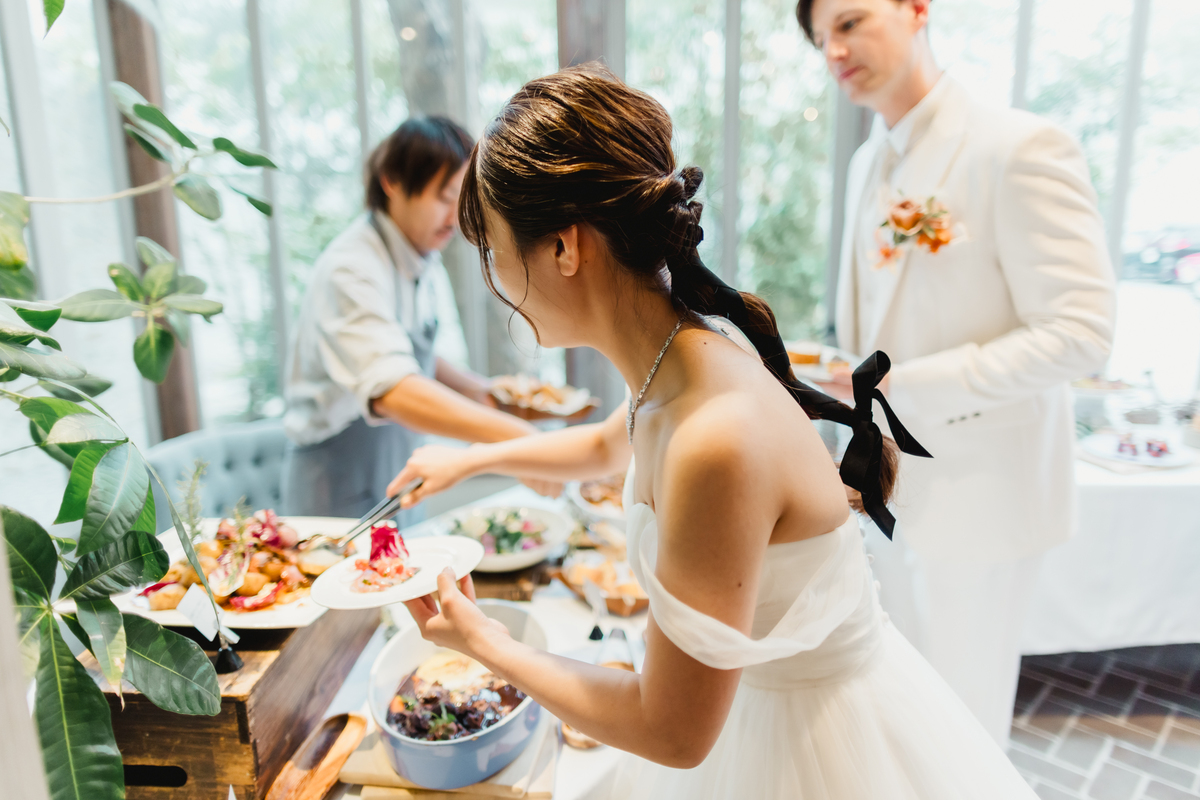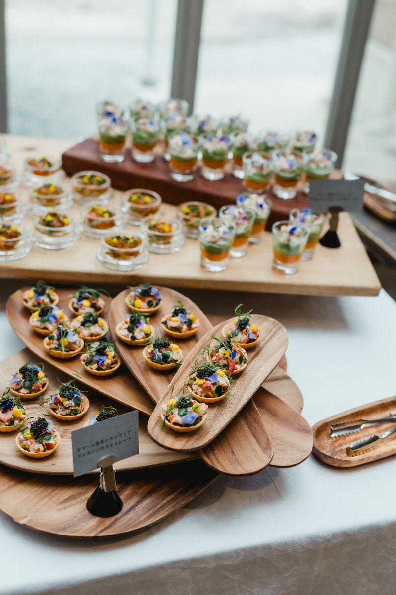 →ゲストも自由に動いて楽しむスタイルがご希望だったため、食事はビュッフェスタイルに。結果ゲスト含めみんなが自由に過ごす事が出来てアットホームな時間を過ごす事が出来ました。