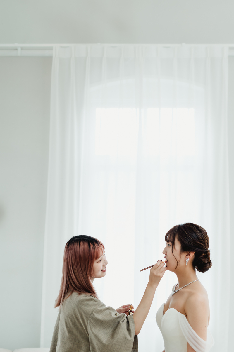 →新婦がどうしても叶えたい事の1つだった、美容師のご友人にヘアセット&メイクしていただく事でした。仲の良いご友人にヘアセットをして頂けてとても幸せそうでした😊