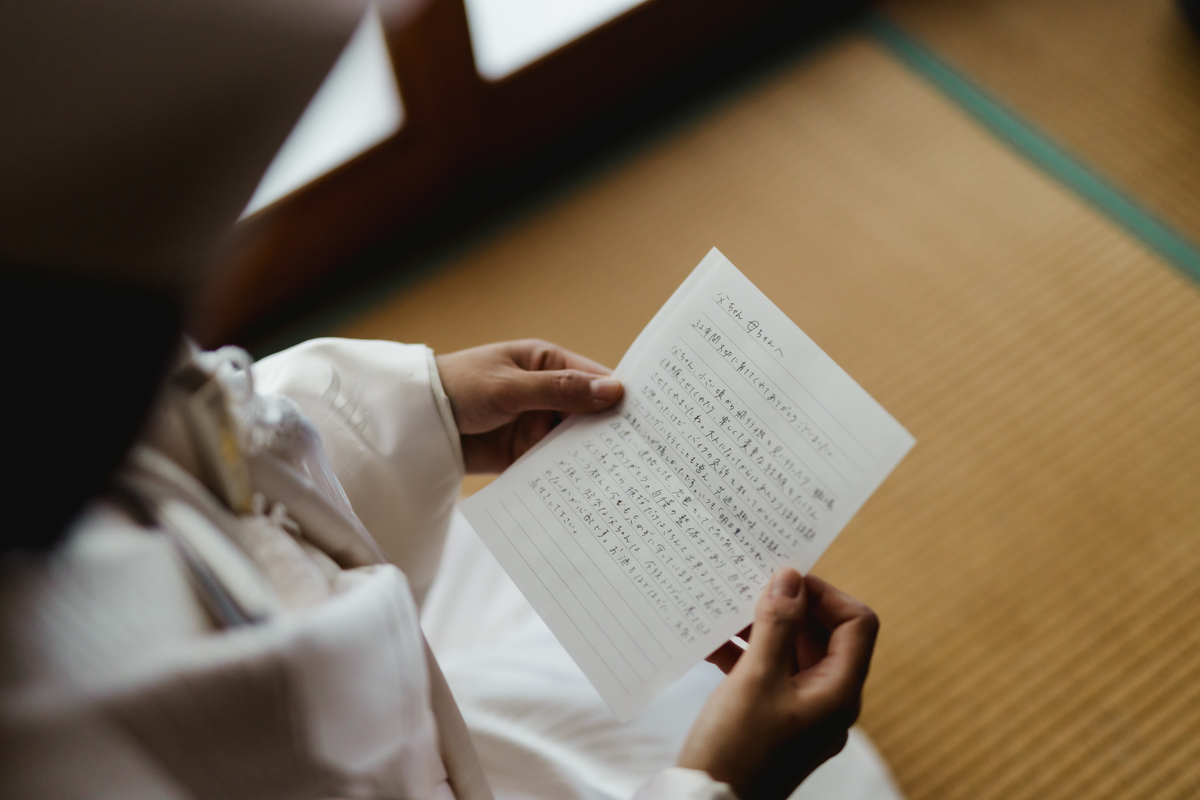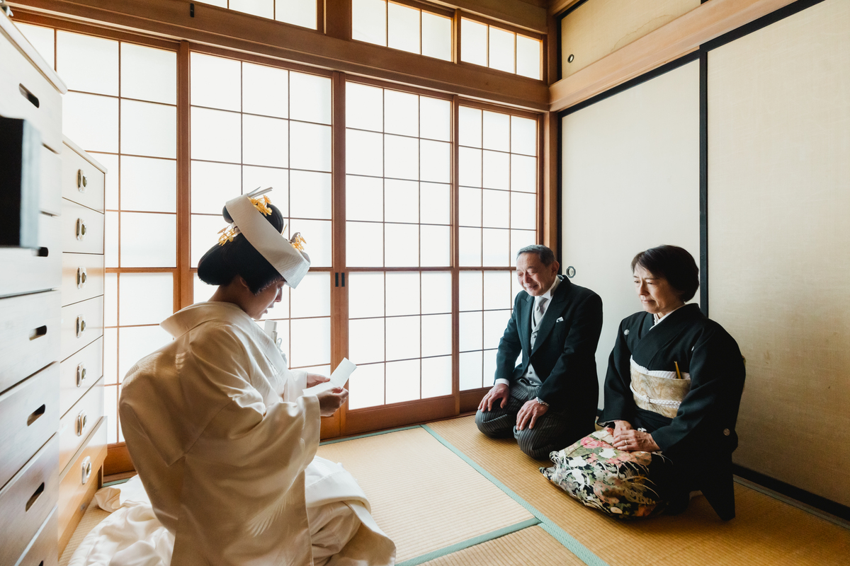 今まで育ってきた実家で支度を整えて、和室でご両親様と改めて向き合い、今までの感謝の気持ちを手紙にして。