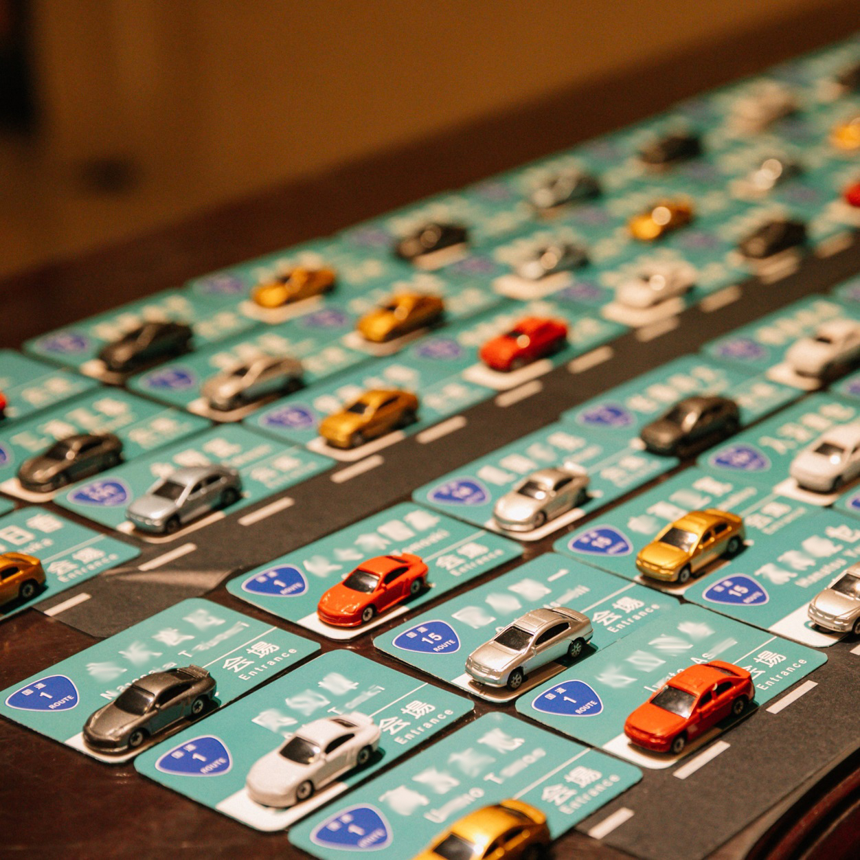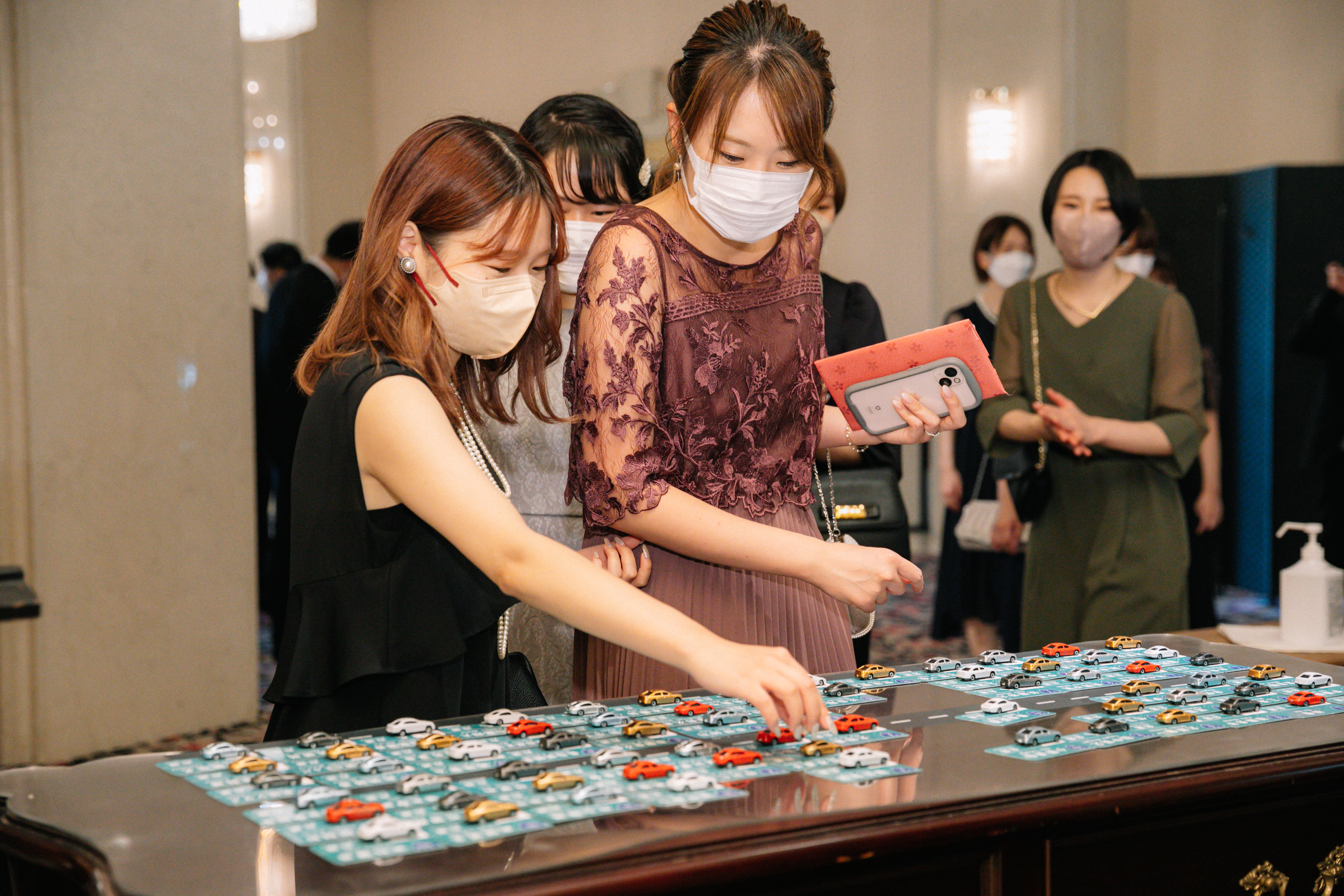 エスコートカードは高速道路の標識に見立ててミニカーと一緒にセット