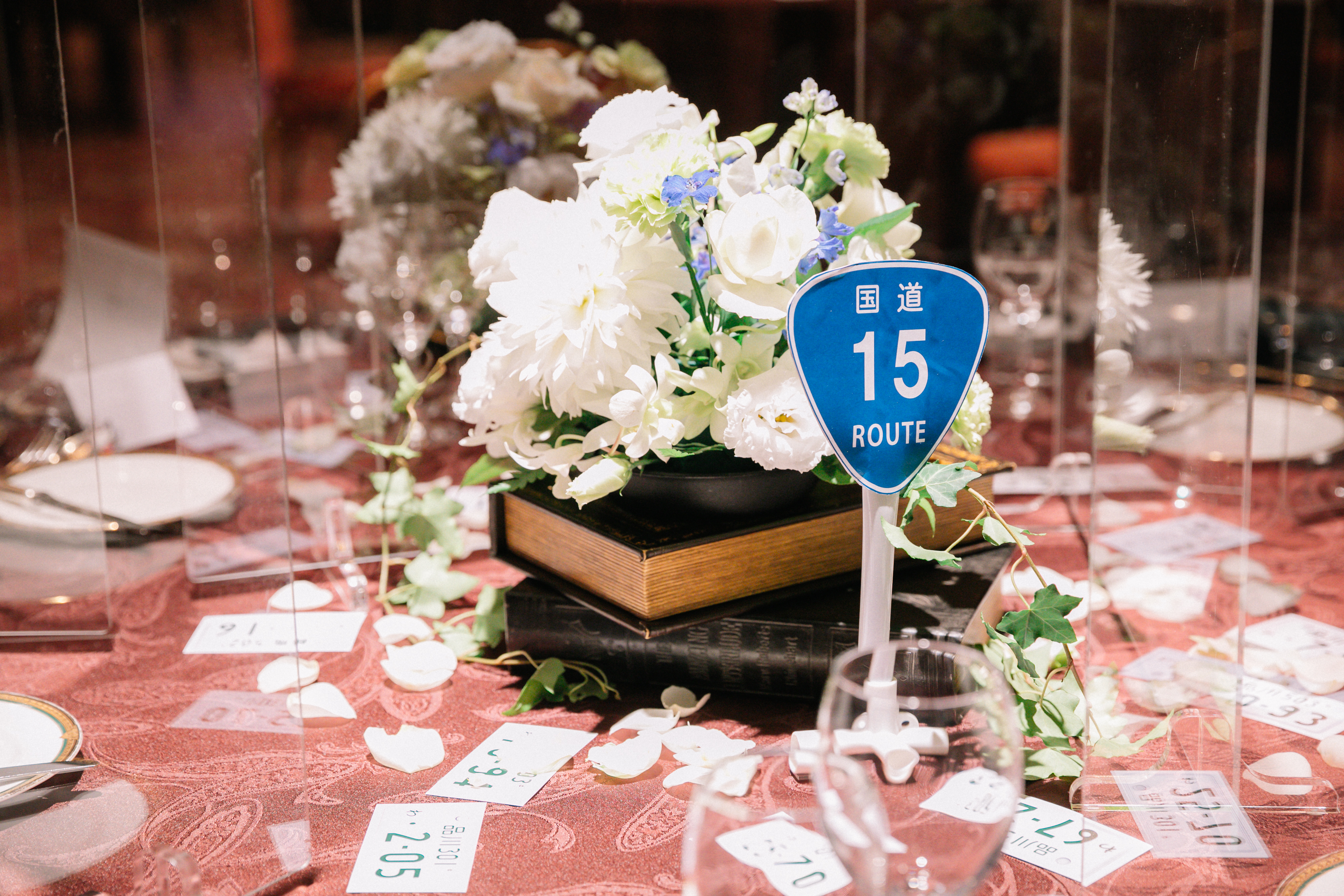 ゲストテーブル上には花びらと一緒にナンバープレートカードで装飾