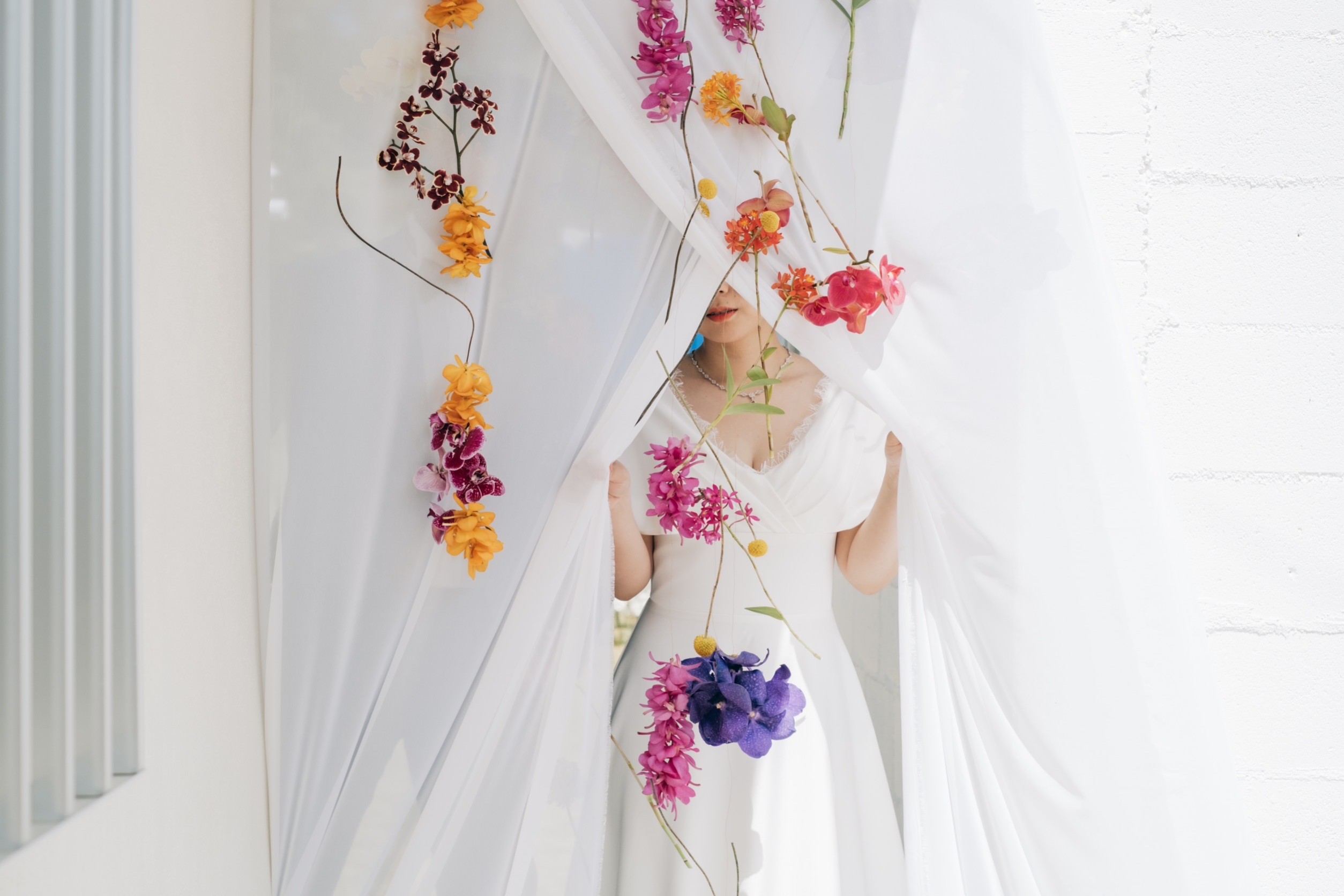 3月の沖縄、優しい光に照らされて風になびくお花と布