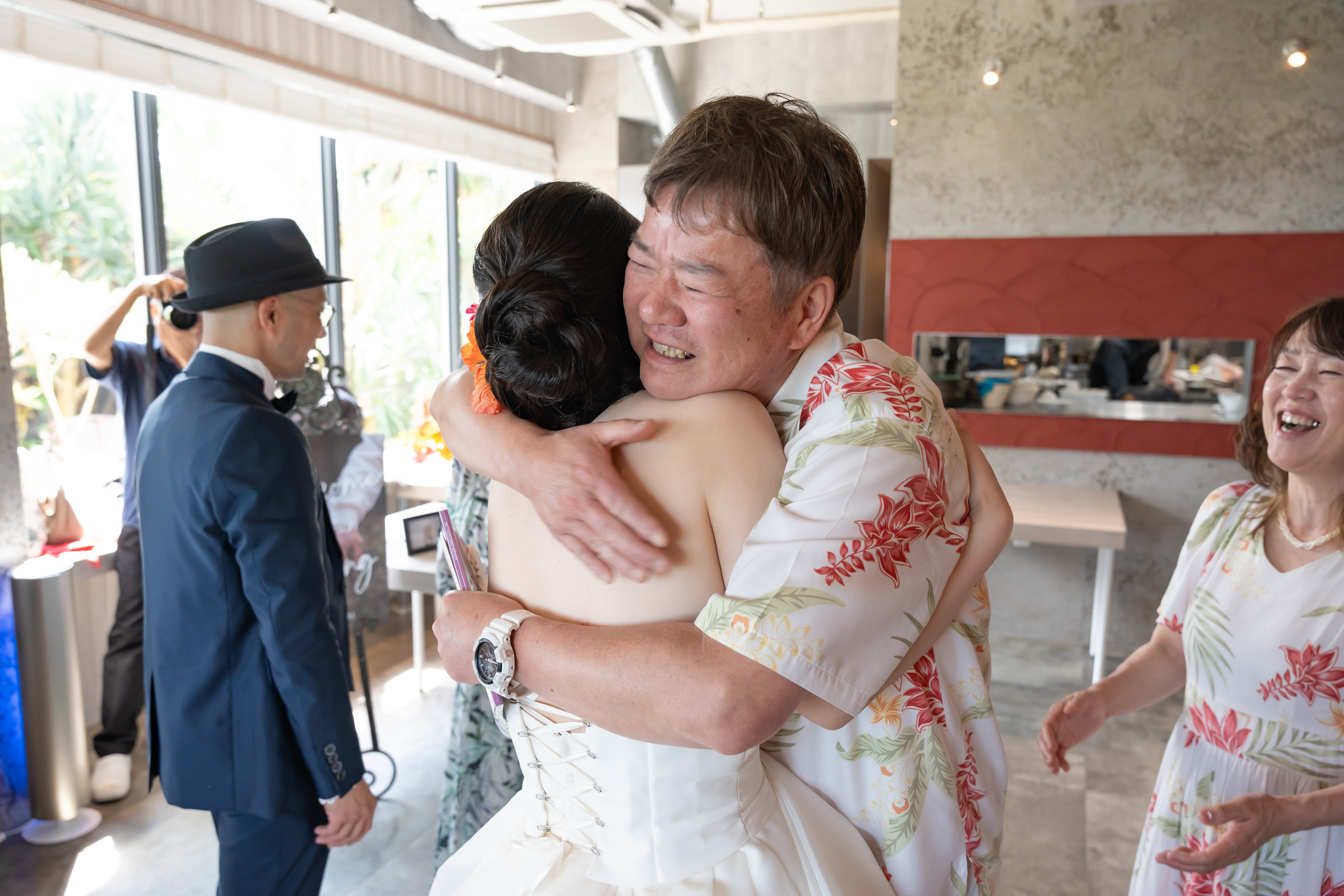 この日はずーっと皆が笑顔でしたが、最後のシーンでは、我慢していた新婦様のお父様が思わず新婦様にハグをされグッとこみ上げるものがありました