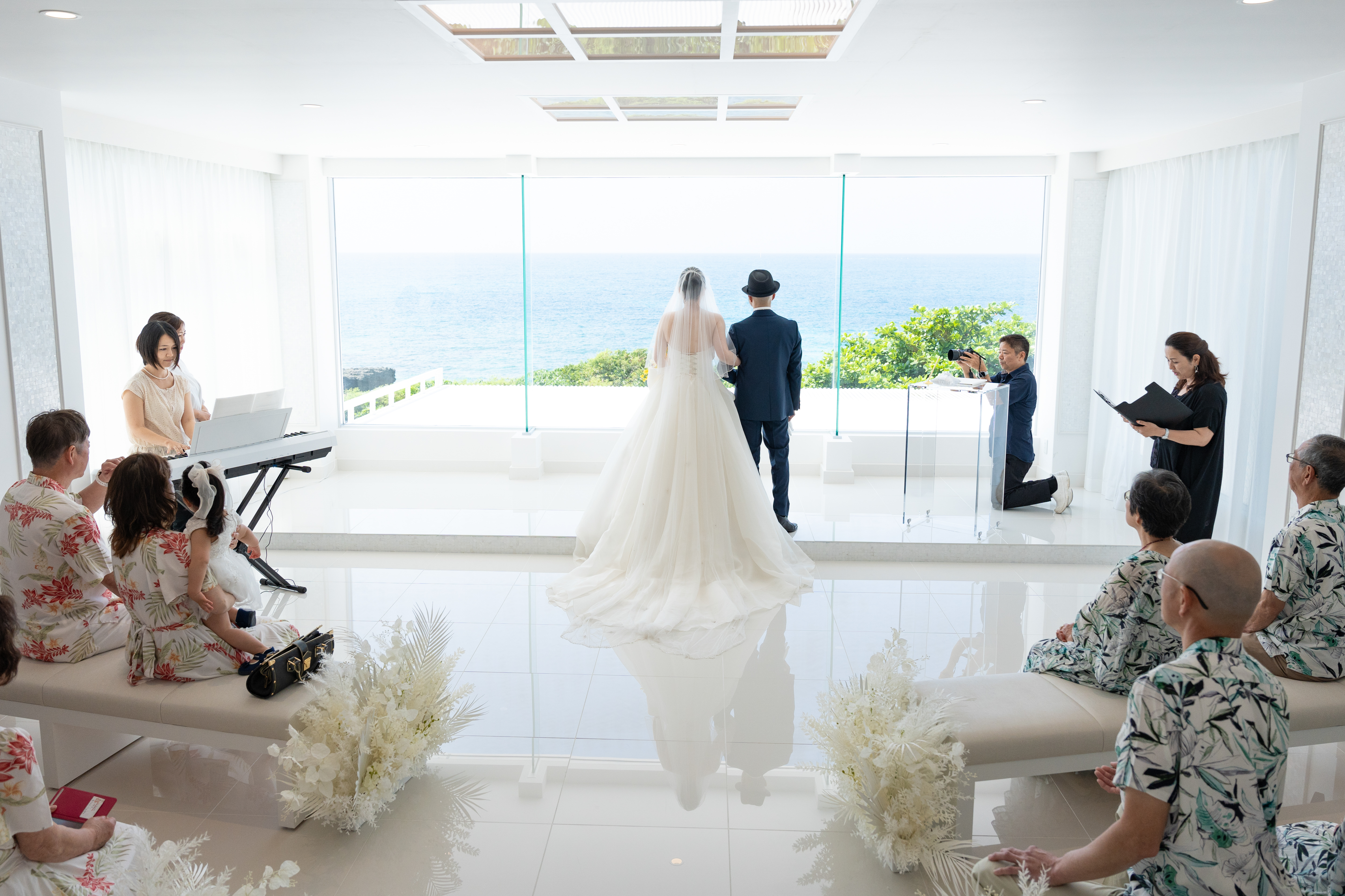 真っ白な会場・正面は真っ青な海と空のシンプルかつ美しいチャペルでした