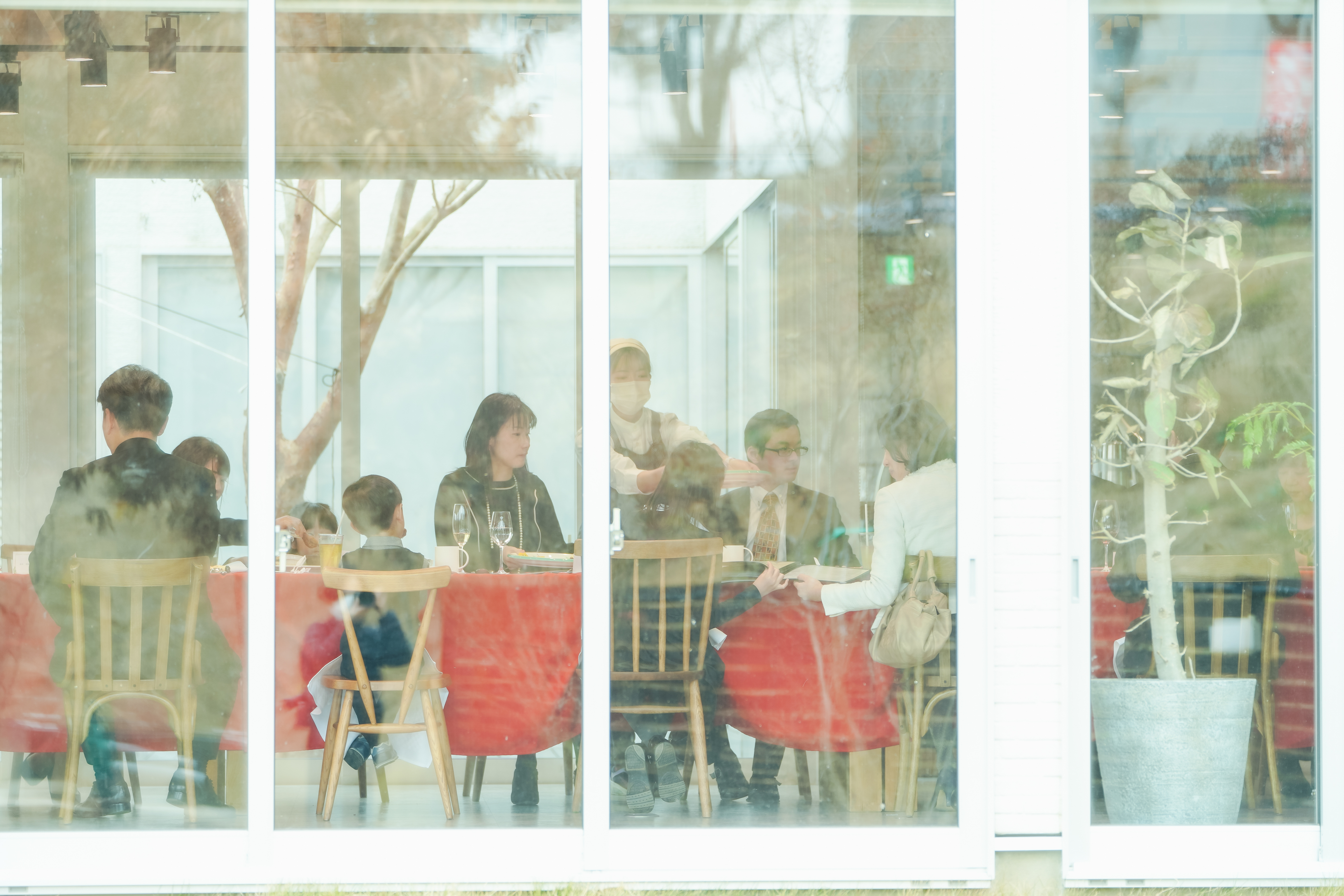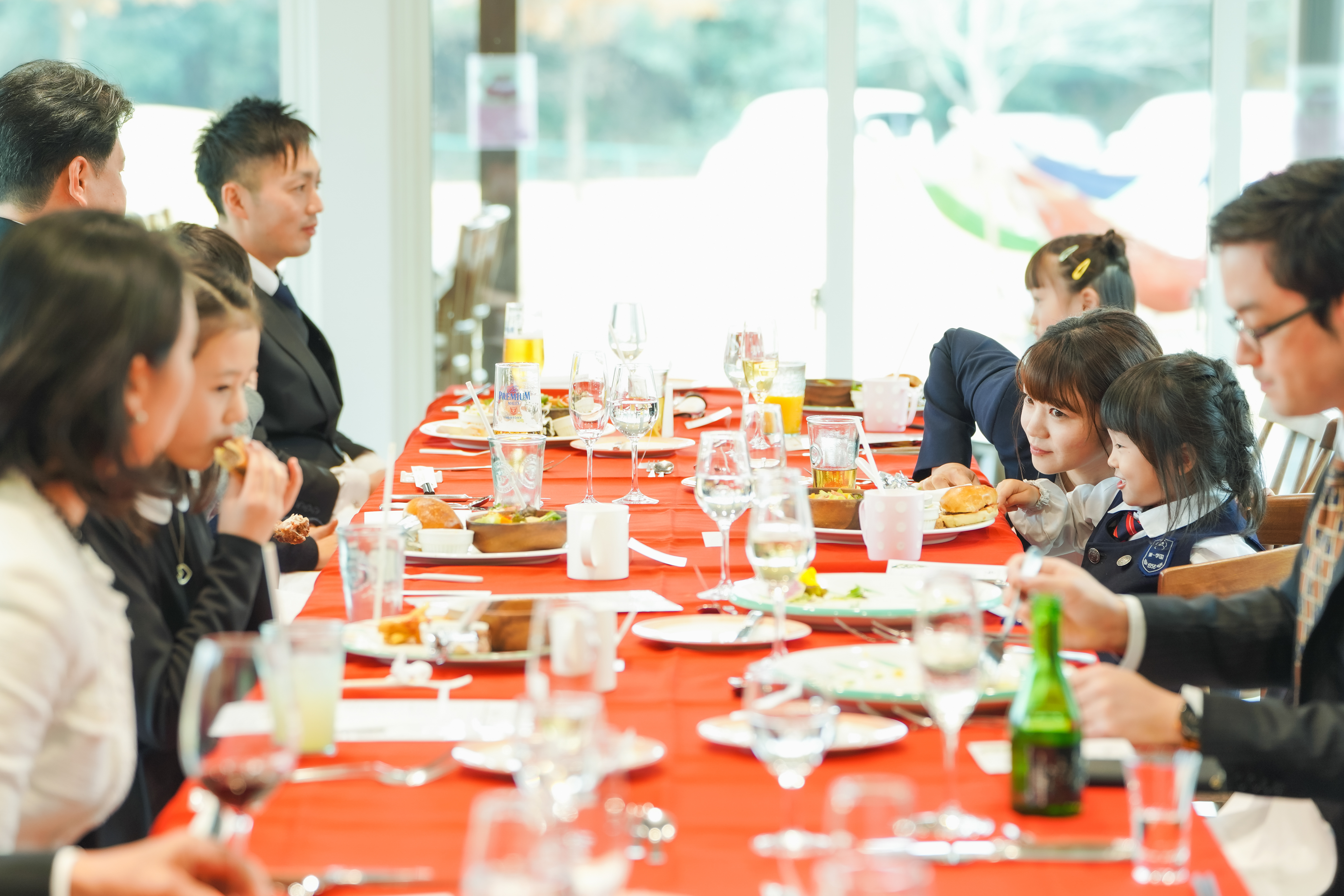 式のあとは、ママトコキッチンBATON で家族だけのささやかなウェディングパーティー。肩肘張らず、みんなで美味しい料理を囲みながら、思い出話に花を咲かせたり、笑い合ったり。新郎新婦が幼いころの話や、家族それぞれのエピソードが飛び交う、まるで「いつもの食卓」のような温かさに包まれた時間でした。