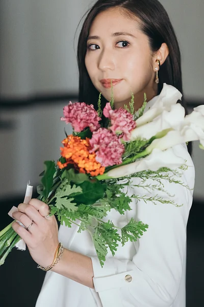 彩り豊かなブーケに顔を寄せるその表情は、未来を見つめる穏やかな眼差し。
