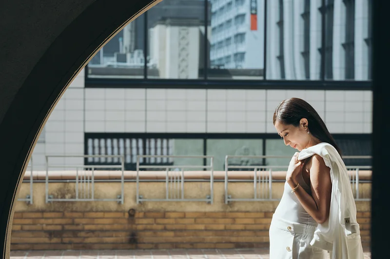 白のセットアップを羽織る姿に、凛とした美しさと母の温もりが同居しています。