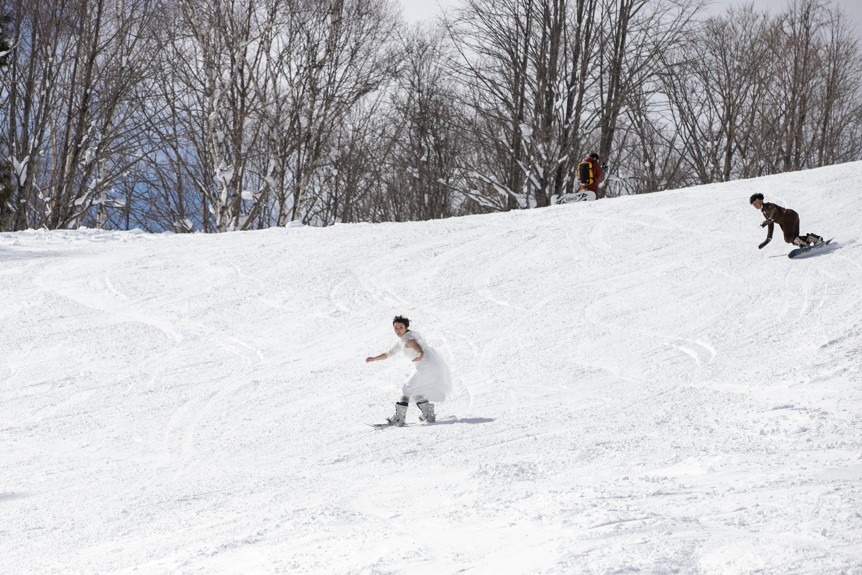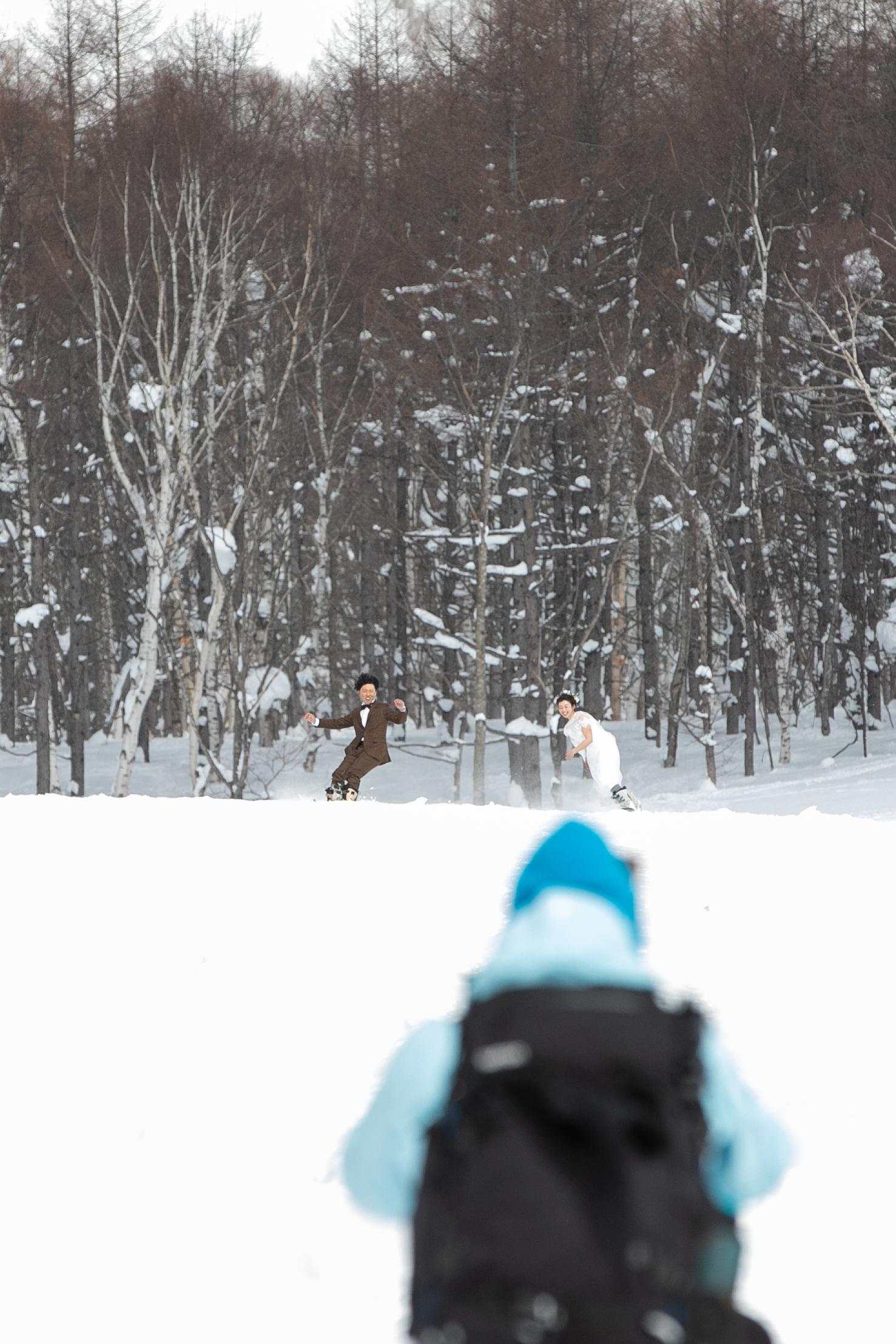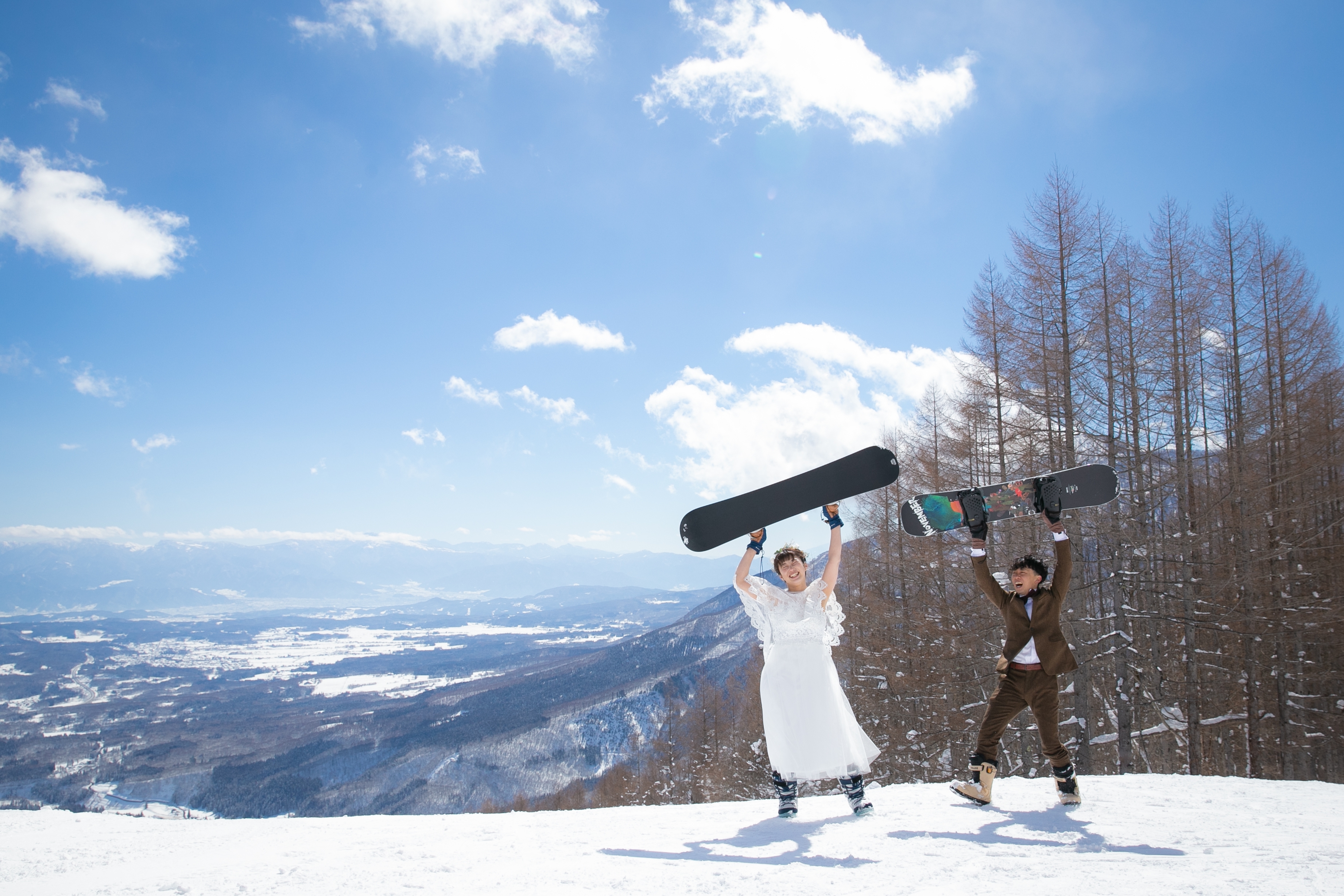 ドレス、スーツはお二人のお持ち込み。 ブーケなどは持たずに撮影しました。 スナップカメラマンもムービーカメラマンも 結婚式のこともわかるスノーボートもできる方なので カメラ機材を持ち滑りながらの撮影。