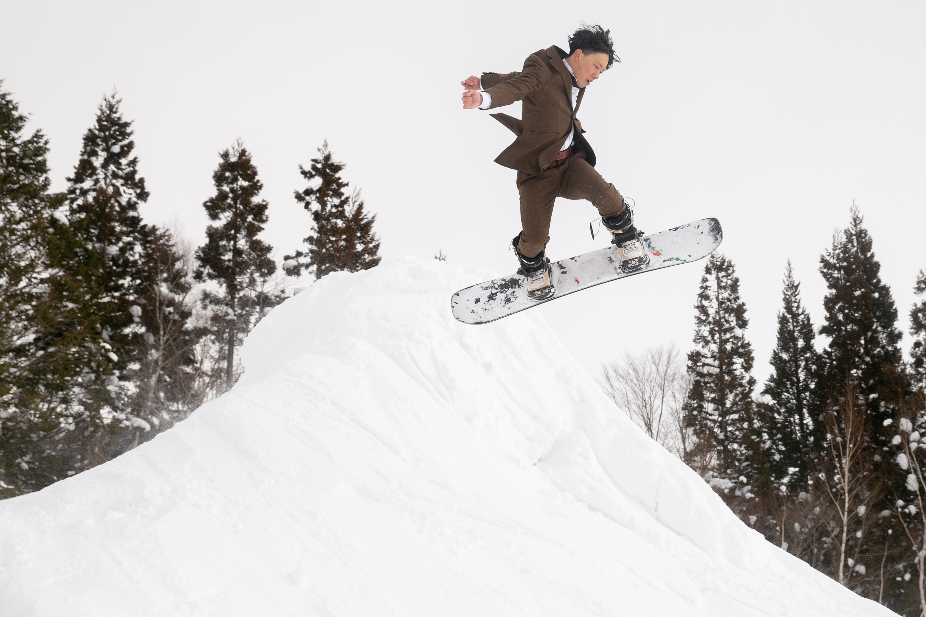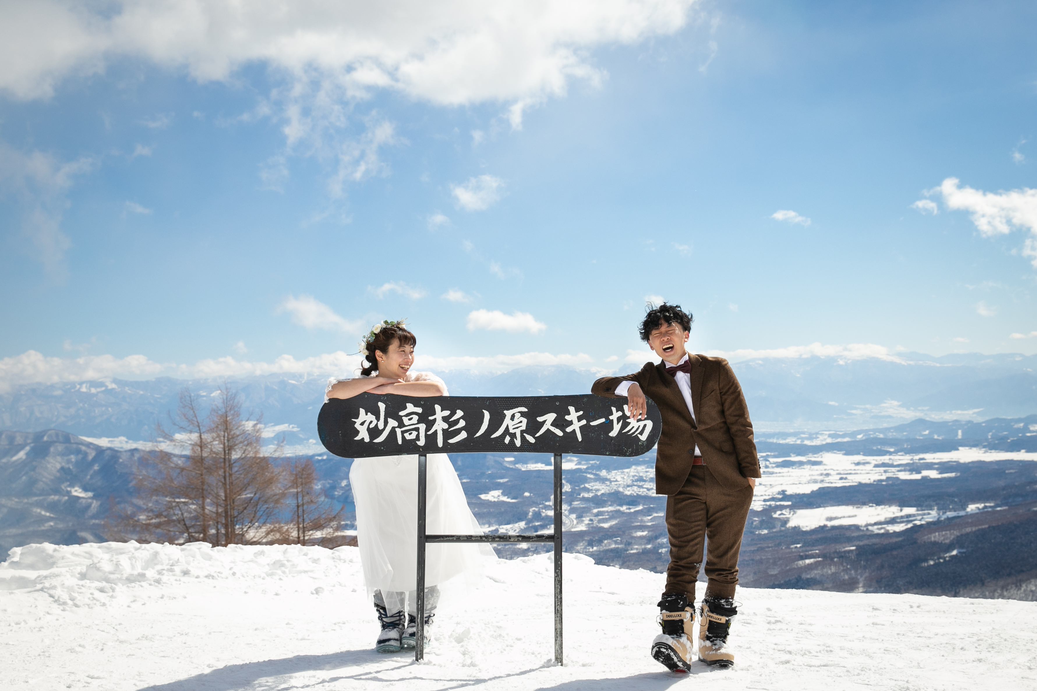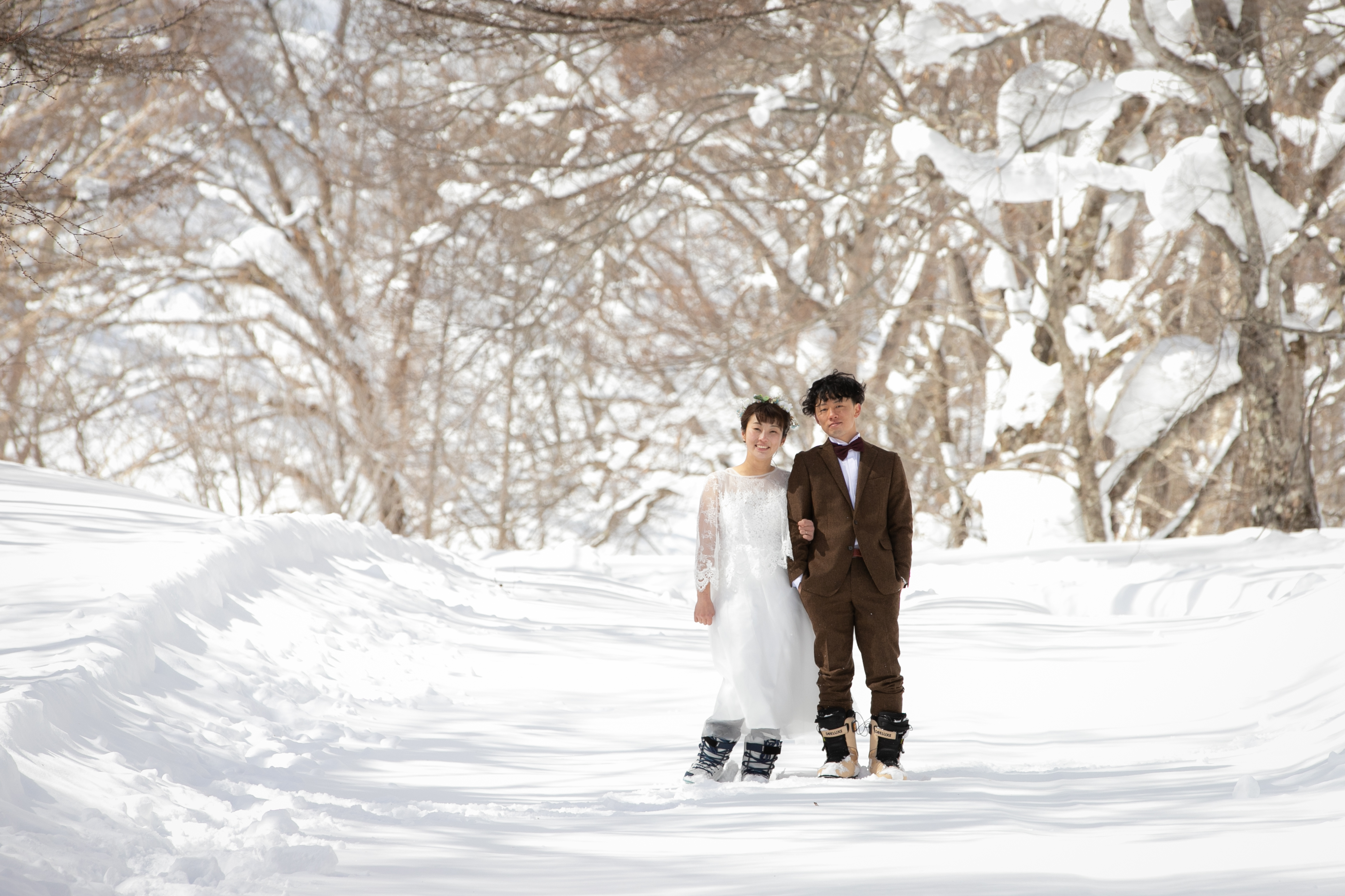 アウトドアが大好きで冬は雪山で滑るためにほぼ毎週のように雪山に通うお二人。 スキー場でウェディングドレス、スーツ姿で滑っているとろこを撮影してもらいたい!!というご要望から前撮りフォト&ムービーを大好きな雪山で撮影しました。