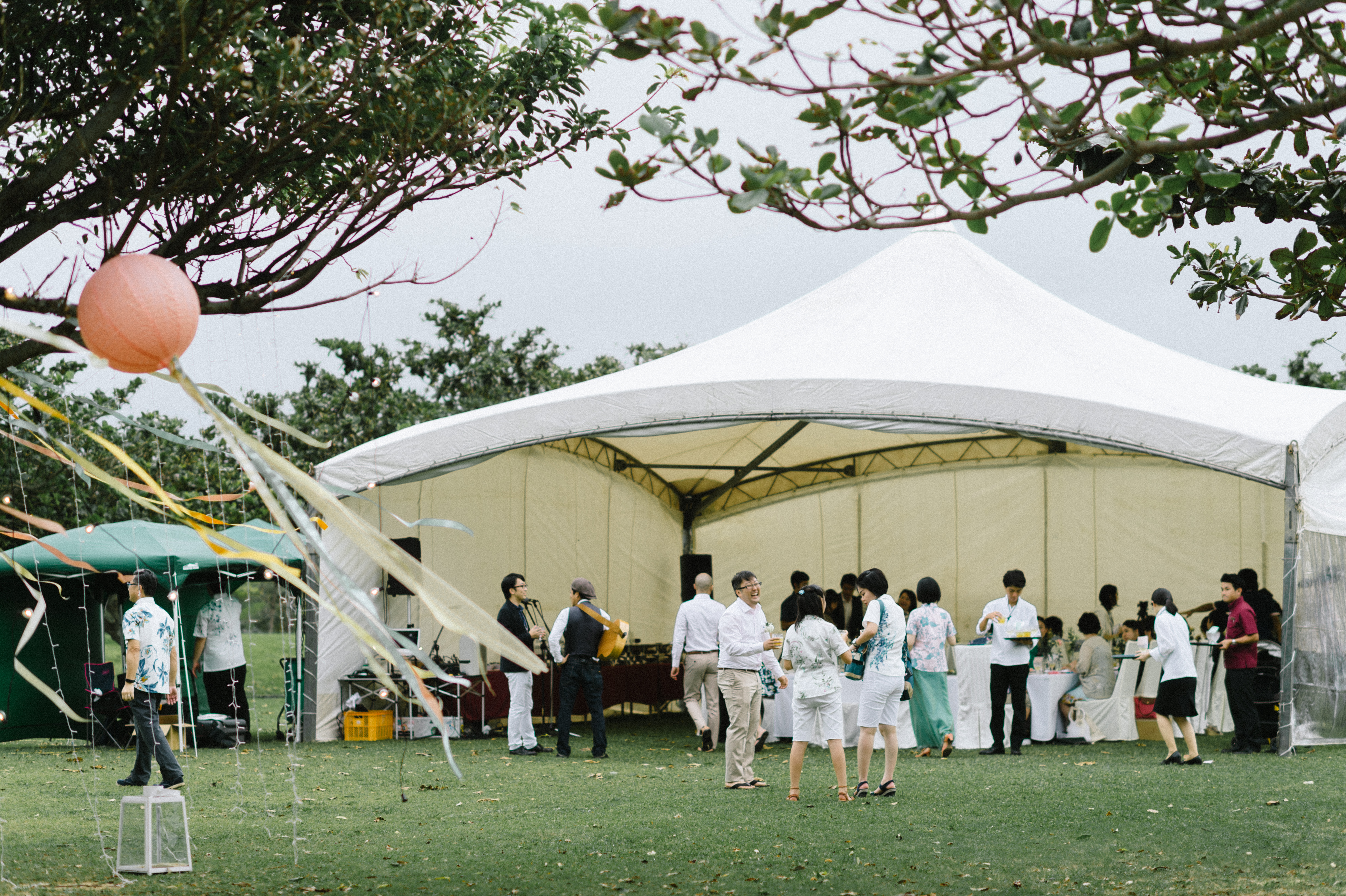 ⑤パーティのフィニッシュは思い出の曲をミュージシャンの方に弾き語りしてもらい、全員で合唱(ウェディングでは新婦様の学生時代のご友人が集まっており、世界を一周する研修の中でみんなで口ずさんでいた思い出の曲)